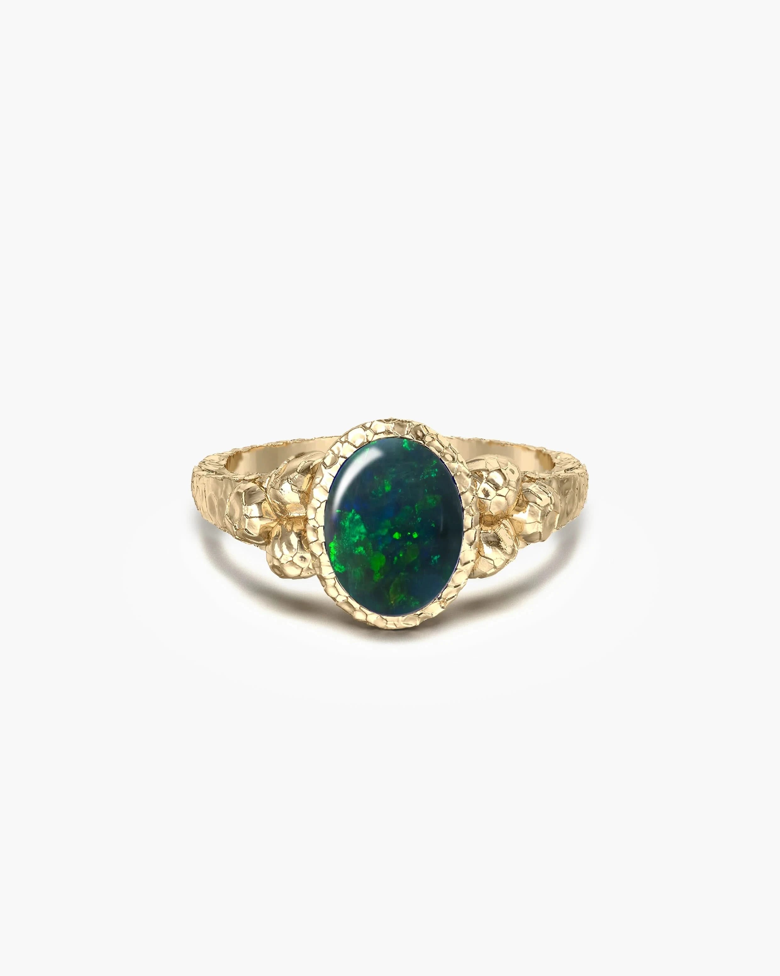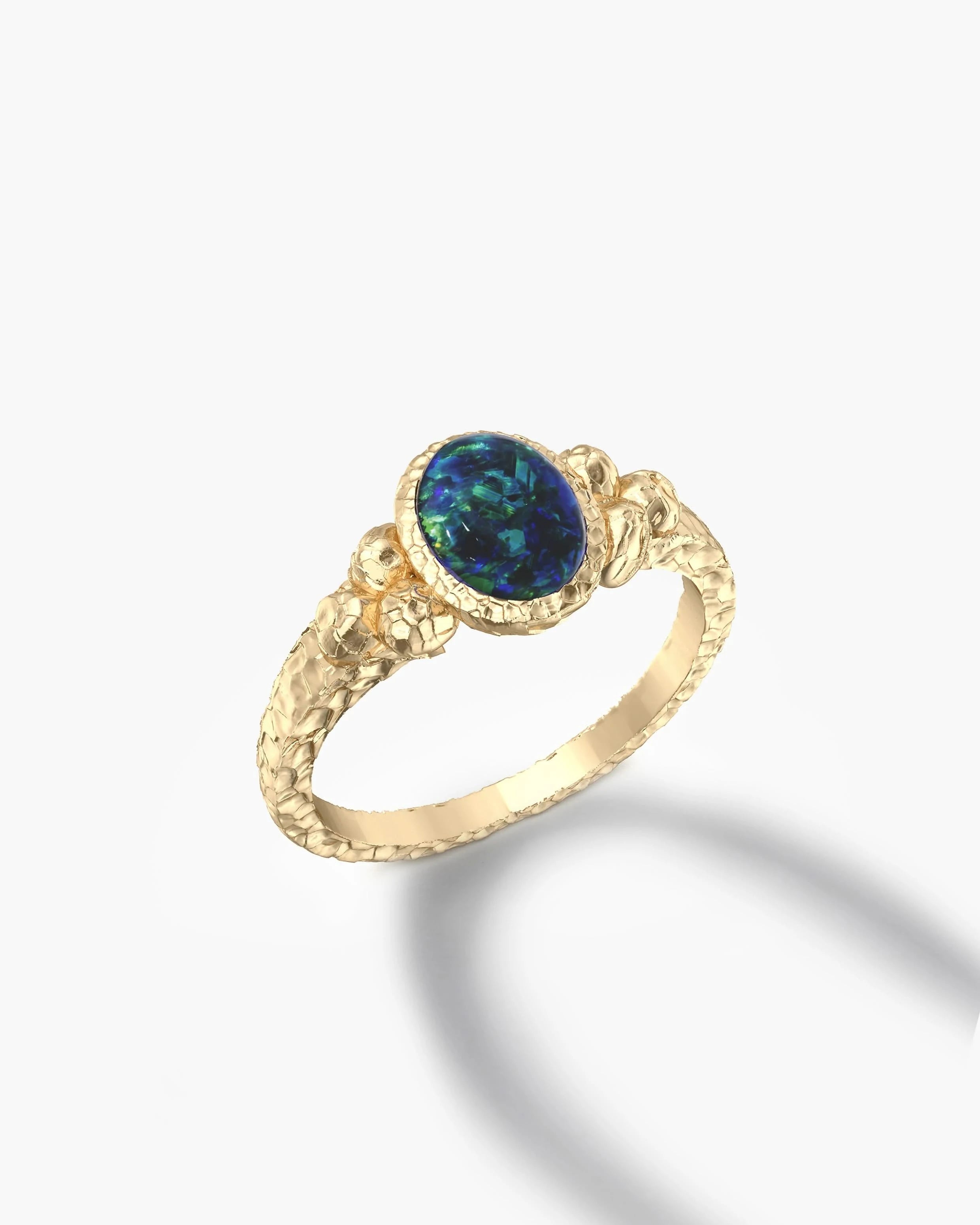 A tribute to retro-industrial aesthetics, six golden ball pillars form dual triangular trusses, securely cradling a oval black opal, its play-of-color reminiscent of Victorian-era gaslight flames. The rock-textured band, finished with gold plating, blends rugged texture with refined brilliance—perfect for collectors who cherish classic mechanical artistry.