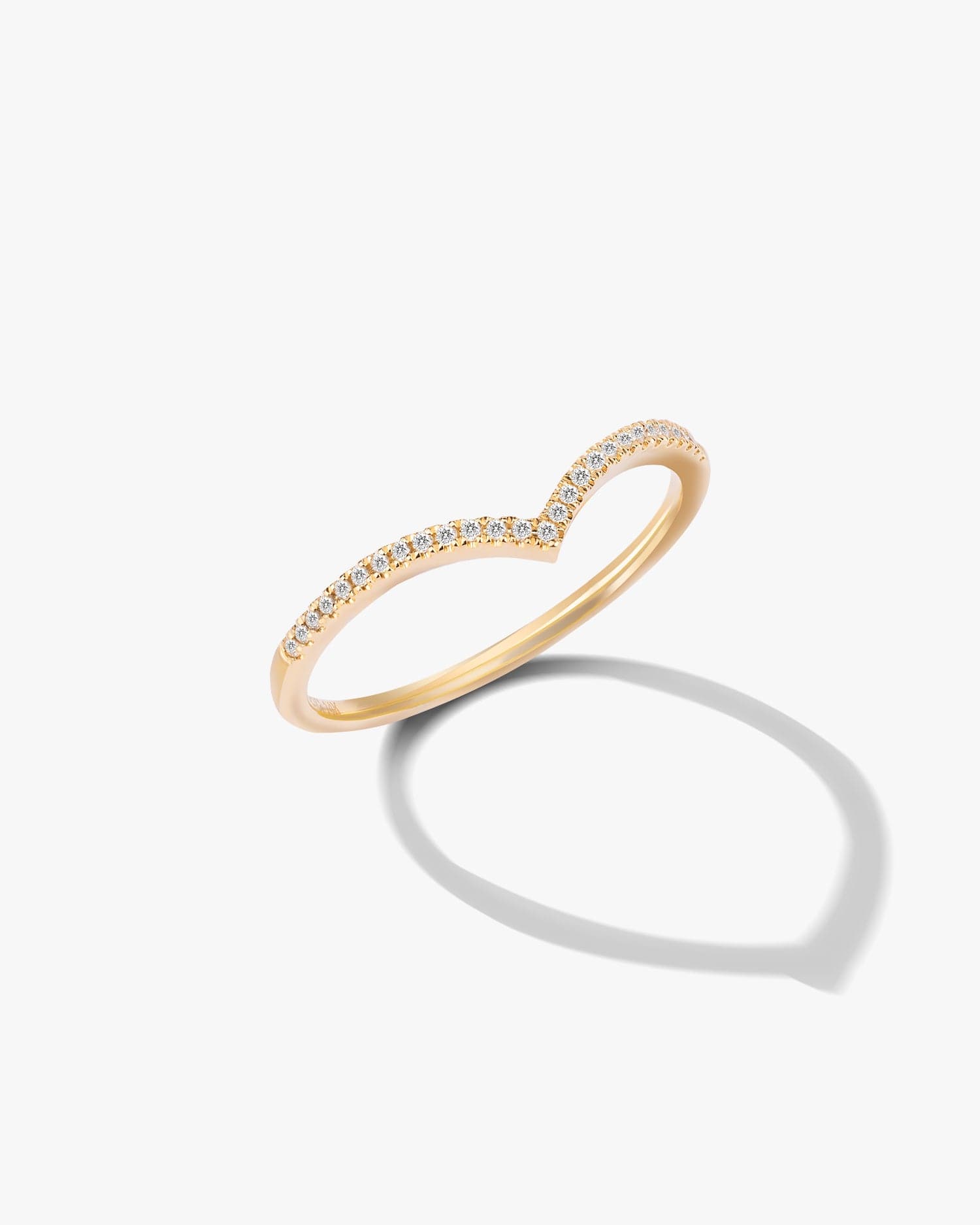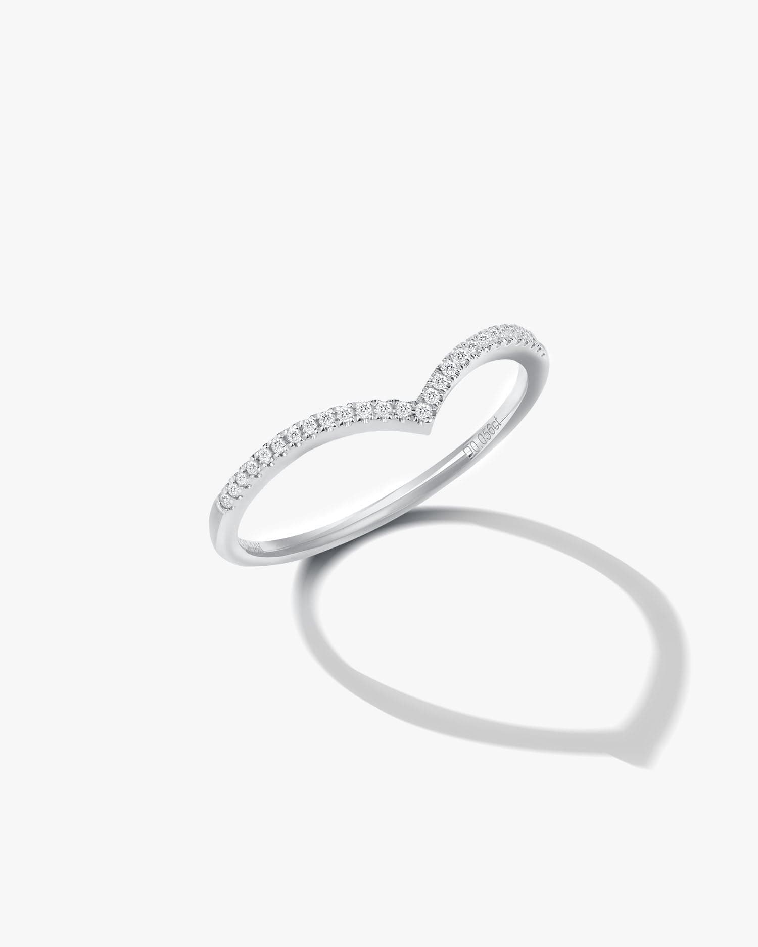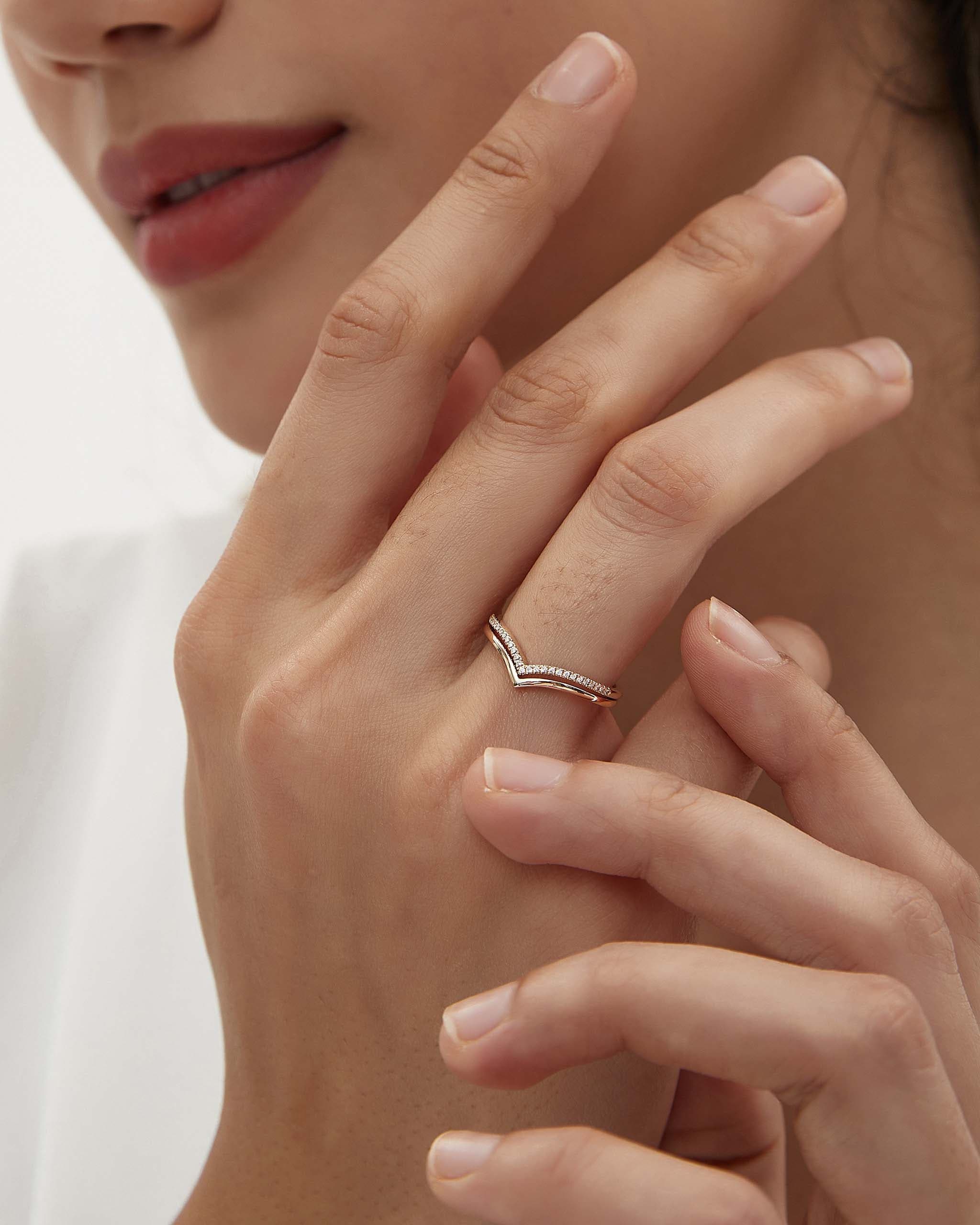The V Chevron Ring is a classic and timeless stacking ring. Paved with finely crushed diamonds, it shines at the fingertips. It is a take on the eternity band, but has the perfect shape to stack with engagement rings.
