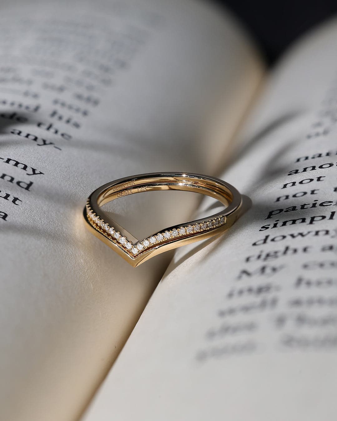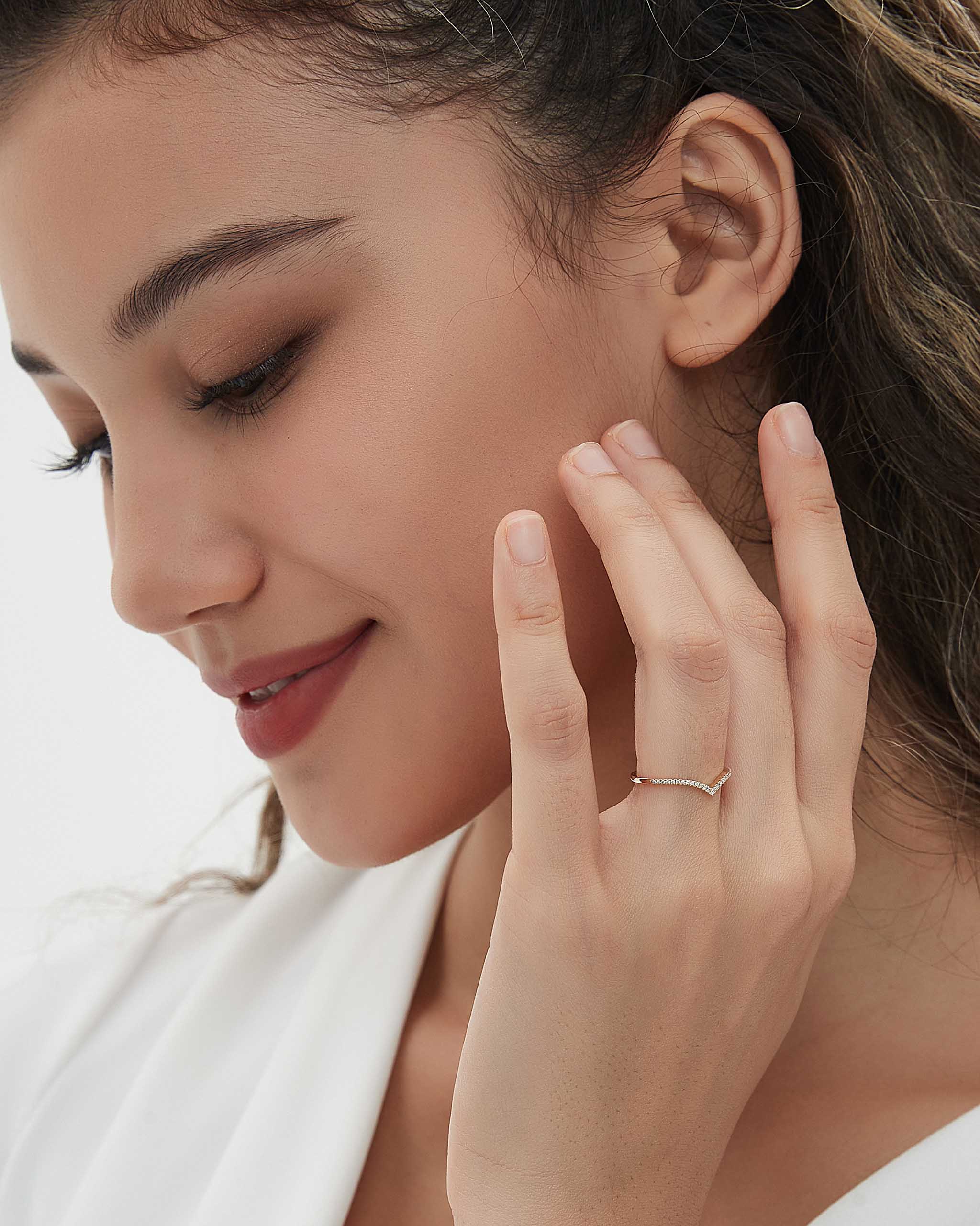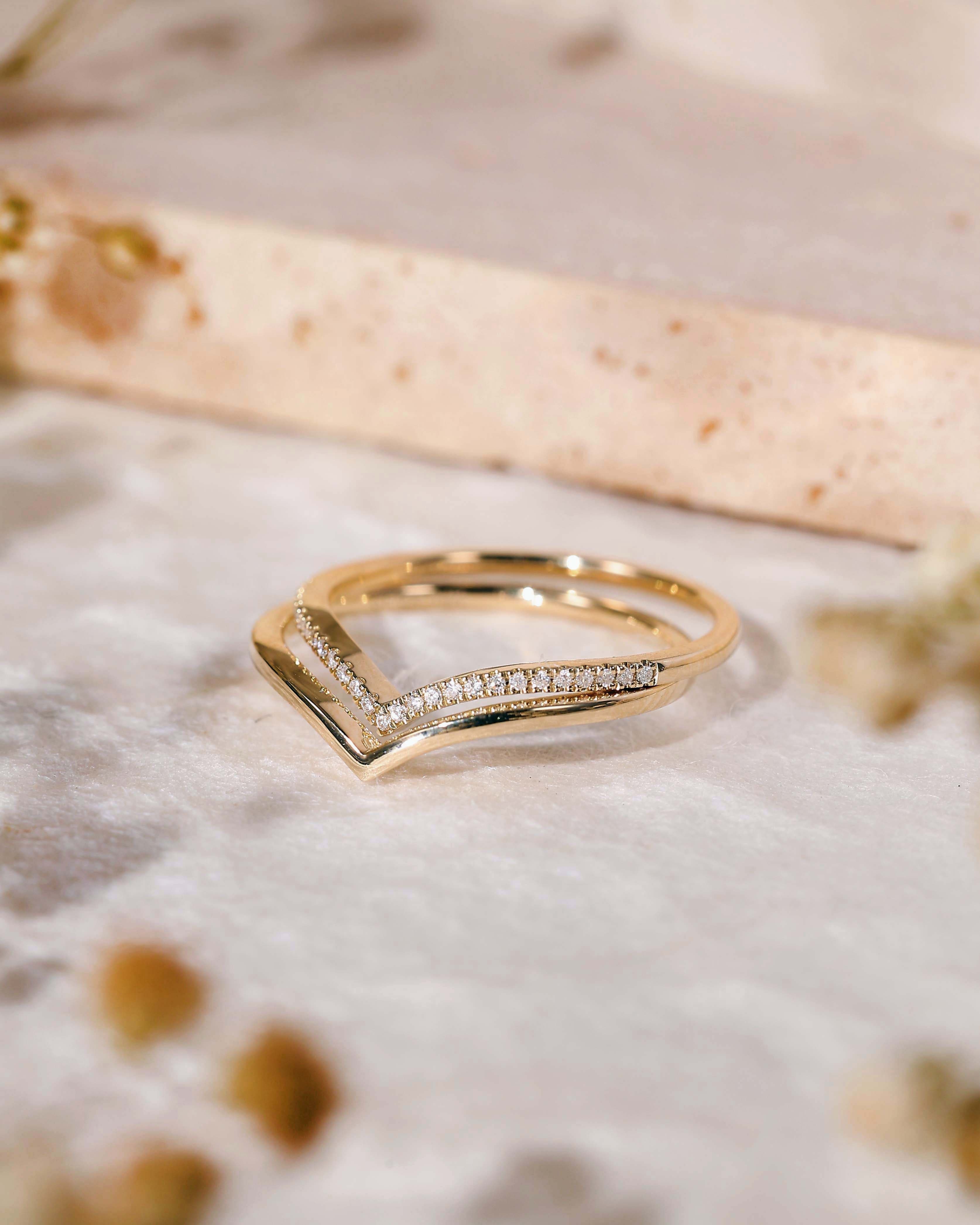 The V Chevron Ring is a classic and timeless stacking ring. Paved with finely crushed diamonds, it shines at the fingertips. It is a take on the eternity band, but has the perfect shape to stack with engagement rings.