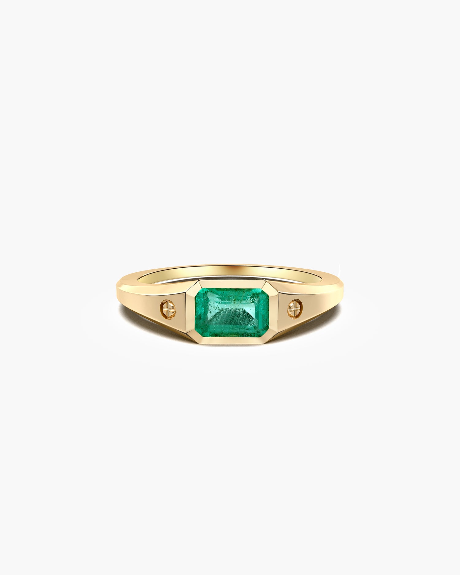 Crafted in 10K gold, this emerald-cut emerald ring features bold industrial lines and a minimalist silhouette, designed for effortless stacking.