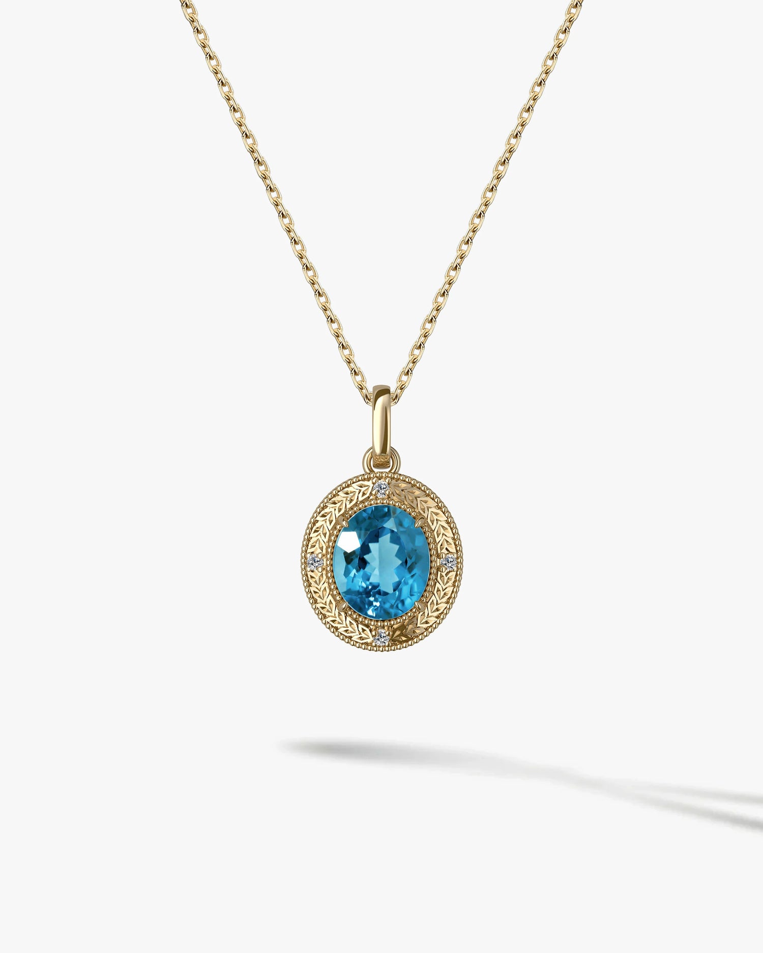 Elegant and timeless, this pendant pairs classical detailing with the tranquil depth of London blue topaz. Crafted in 925 silver with rich gold plating, the piece centers around an oval-cut gemstone whose cool, oceanic brilliance radiates from within a finely sculpted frame. The surrounding halo features laurel-leaf engravings—symbols of victory, wisdom, and renewal—interspersed with petite accent stones that add gentle flashes of light. Milgrain beading along the edges enhances the vintage-inspired silhouette, giving the pendant a refined, heirloom feel. The result is a harmonious blend of artistry and serenity, perfect for those who love jewelry that carries symbolic elegance.