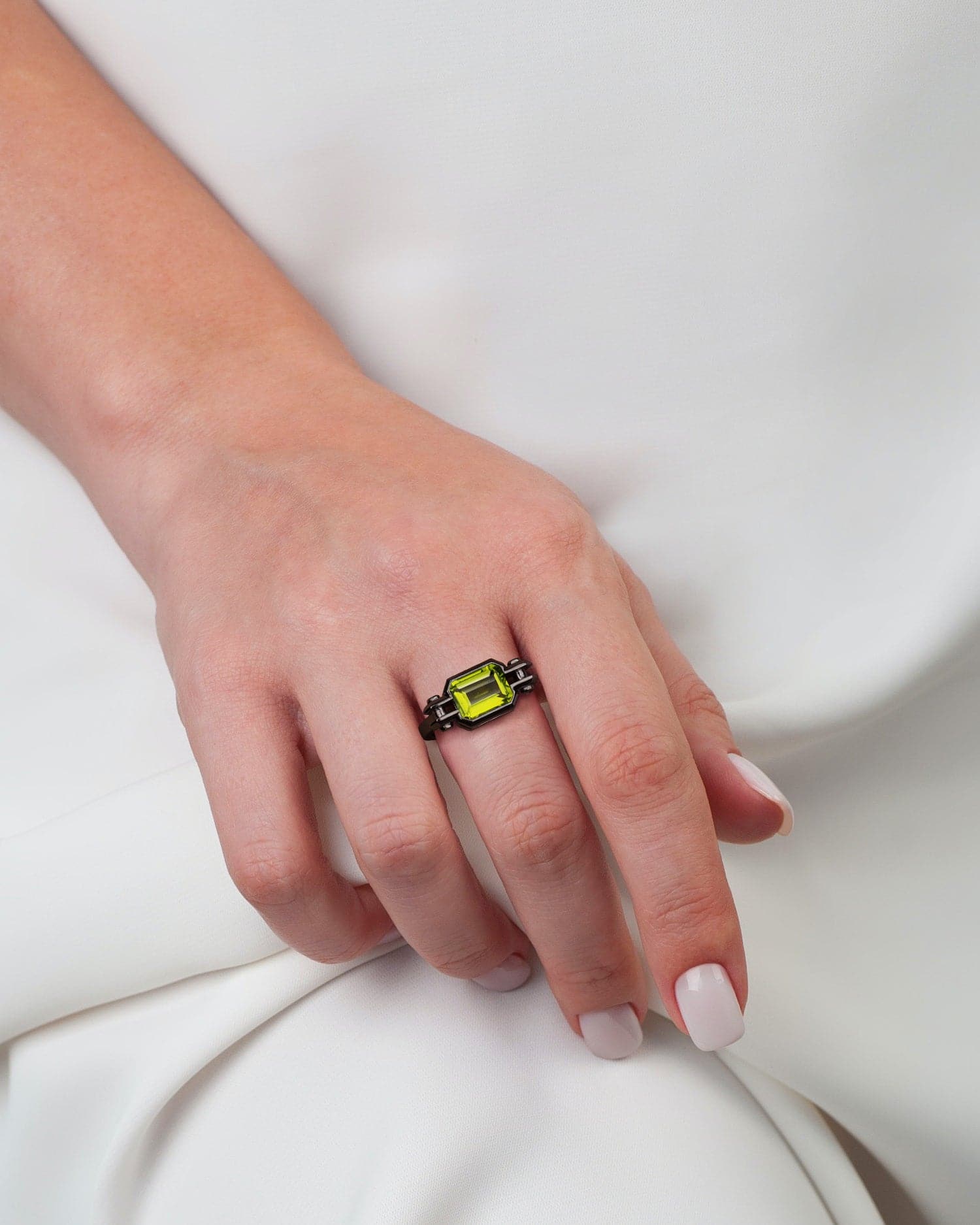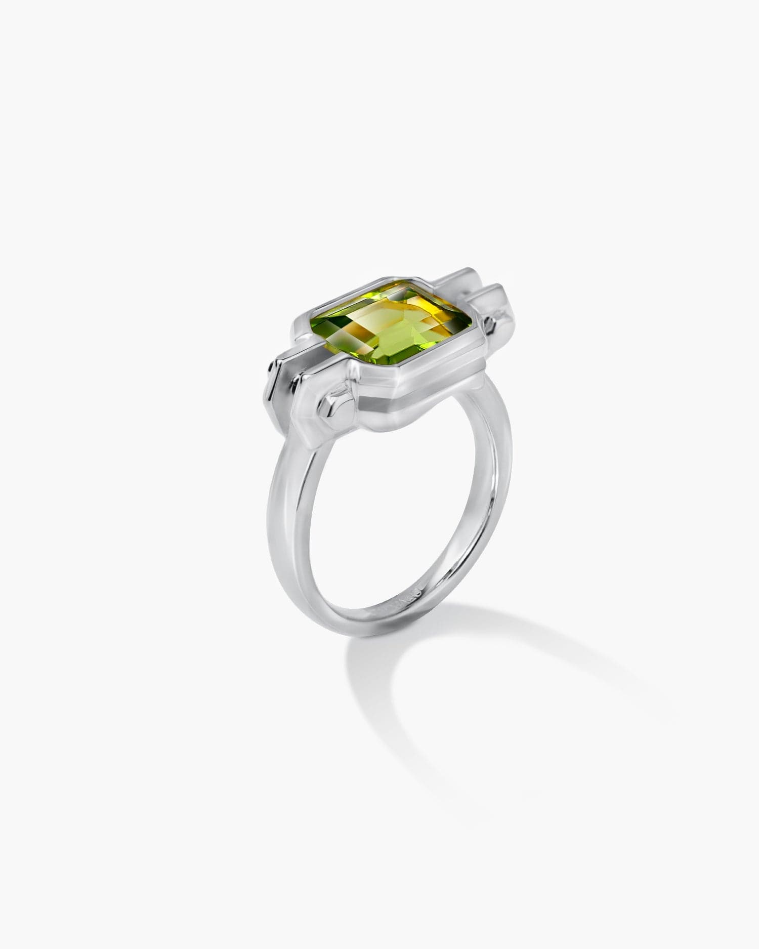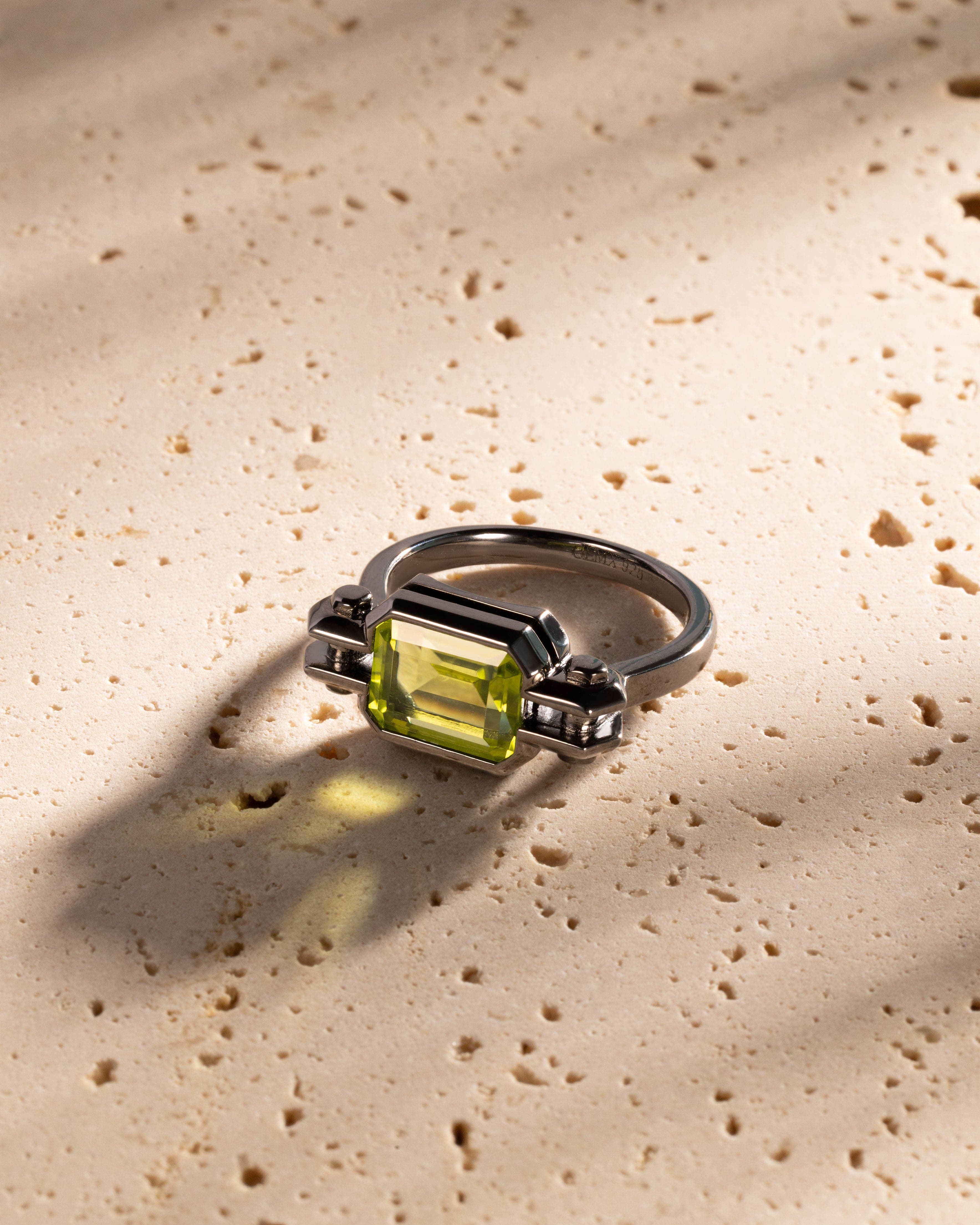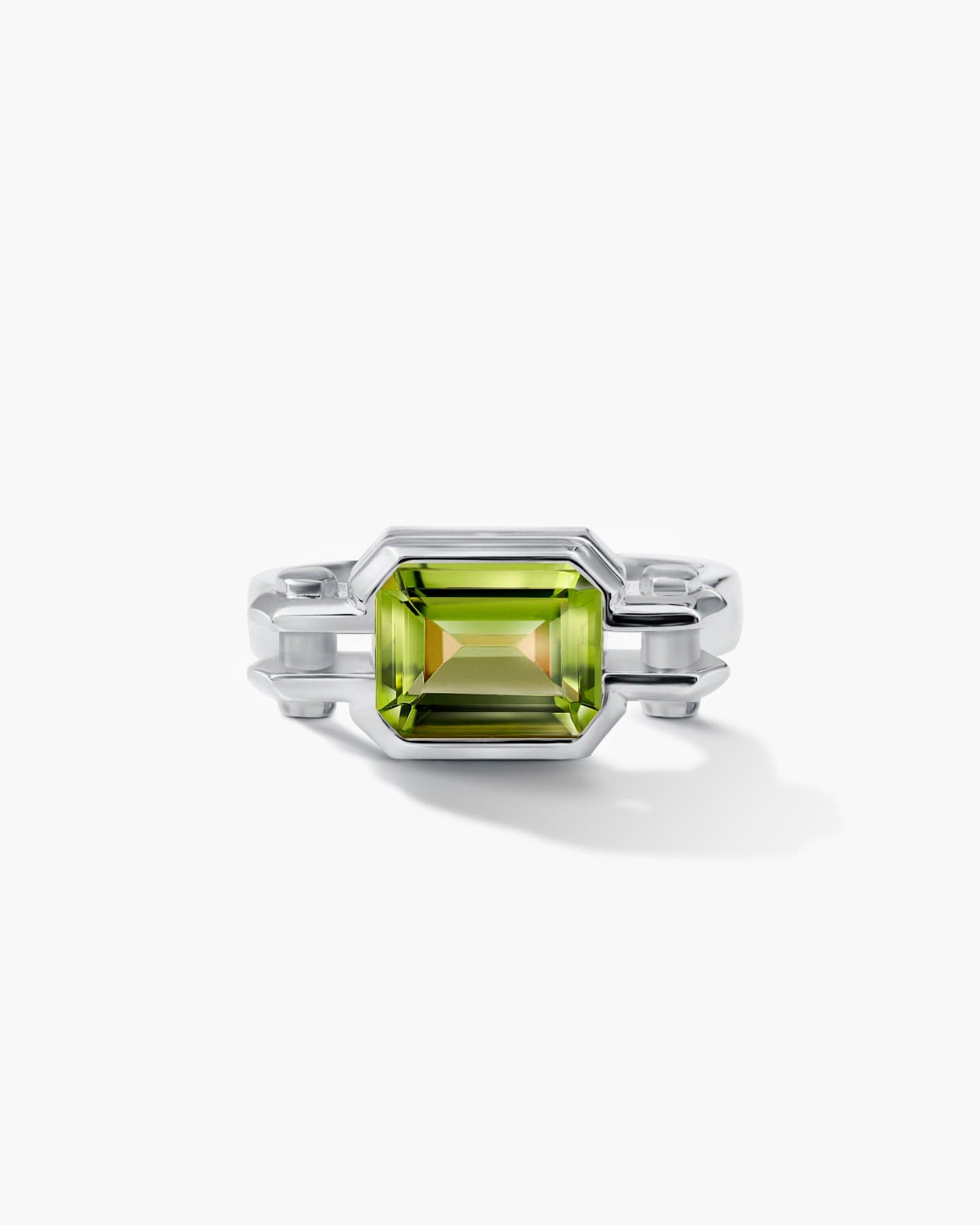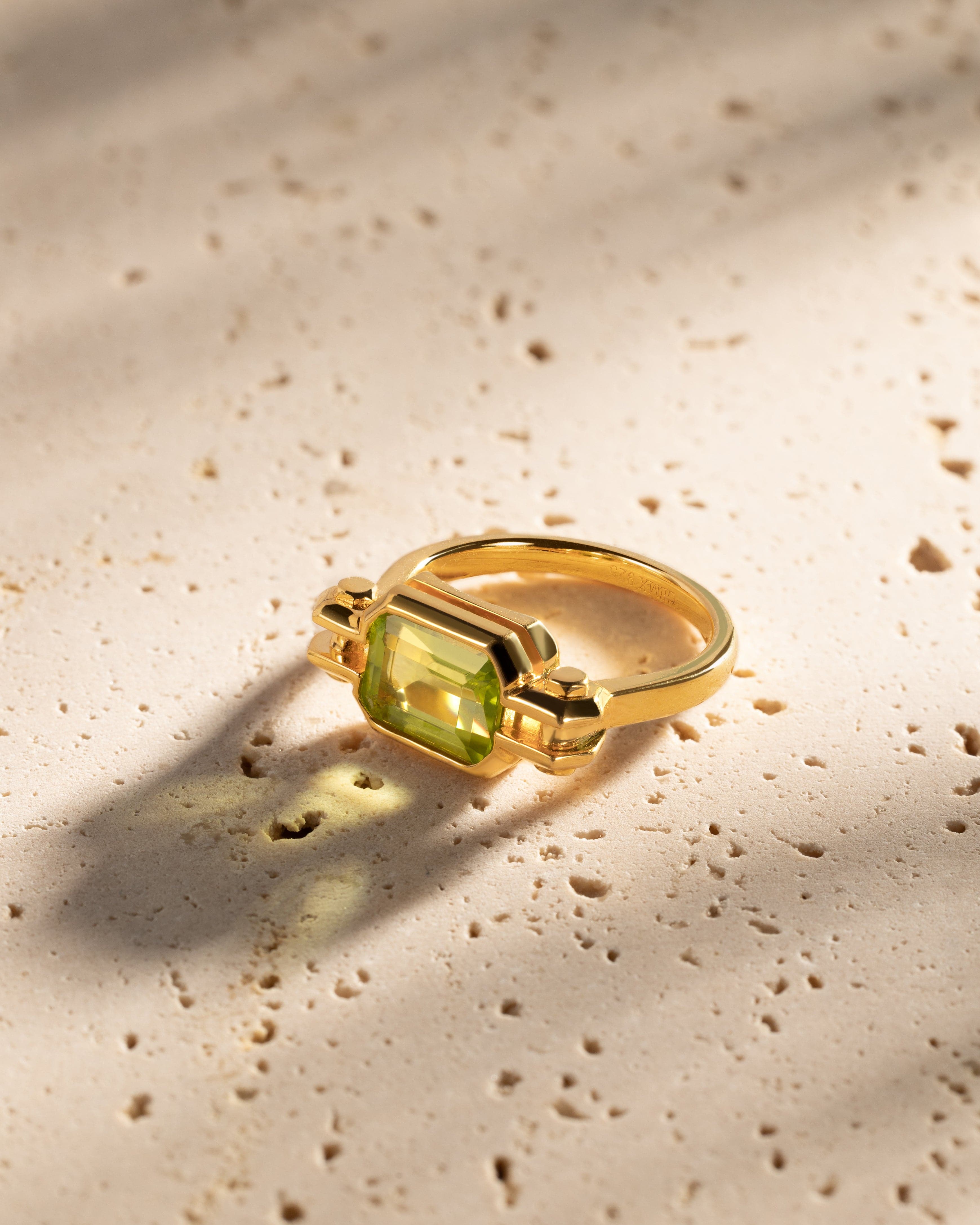 From the Build Collection, this 925 silver ring showcases two emerald-cut topaz stones on an open band, merging architectural precision with minimalist elegance.