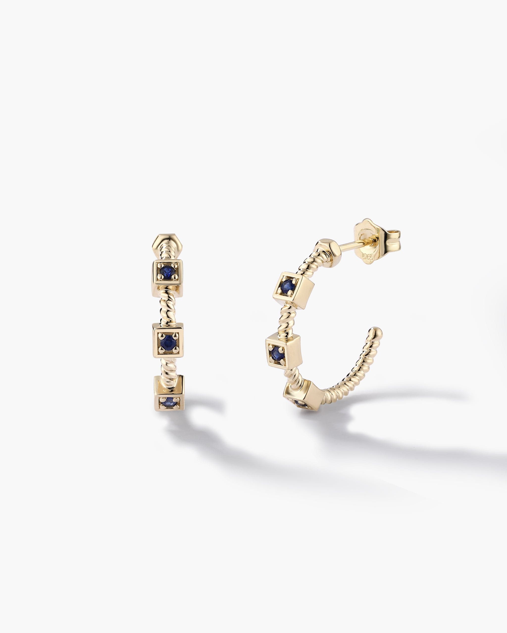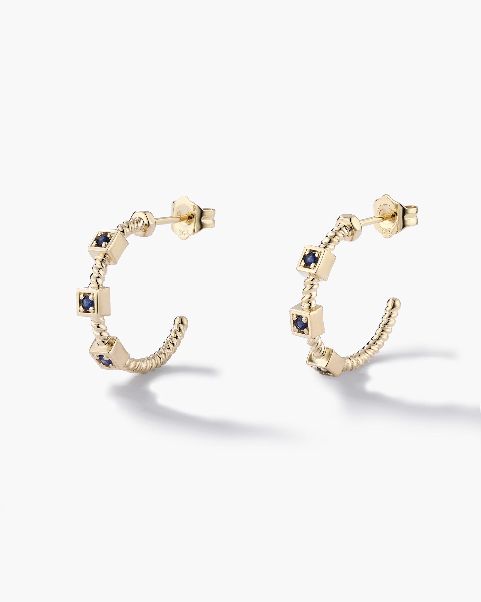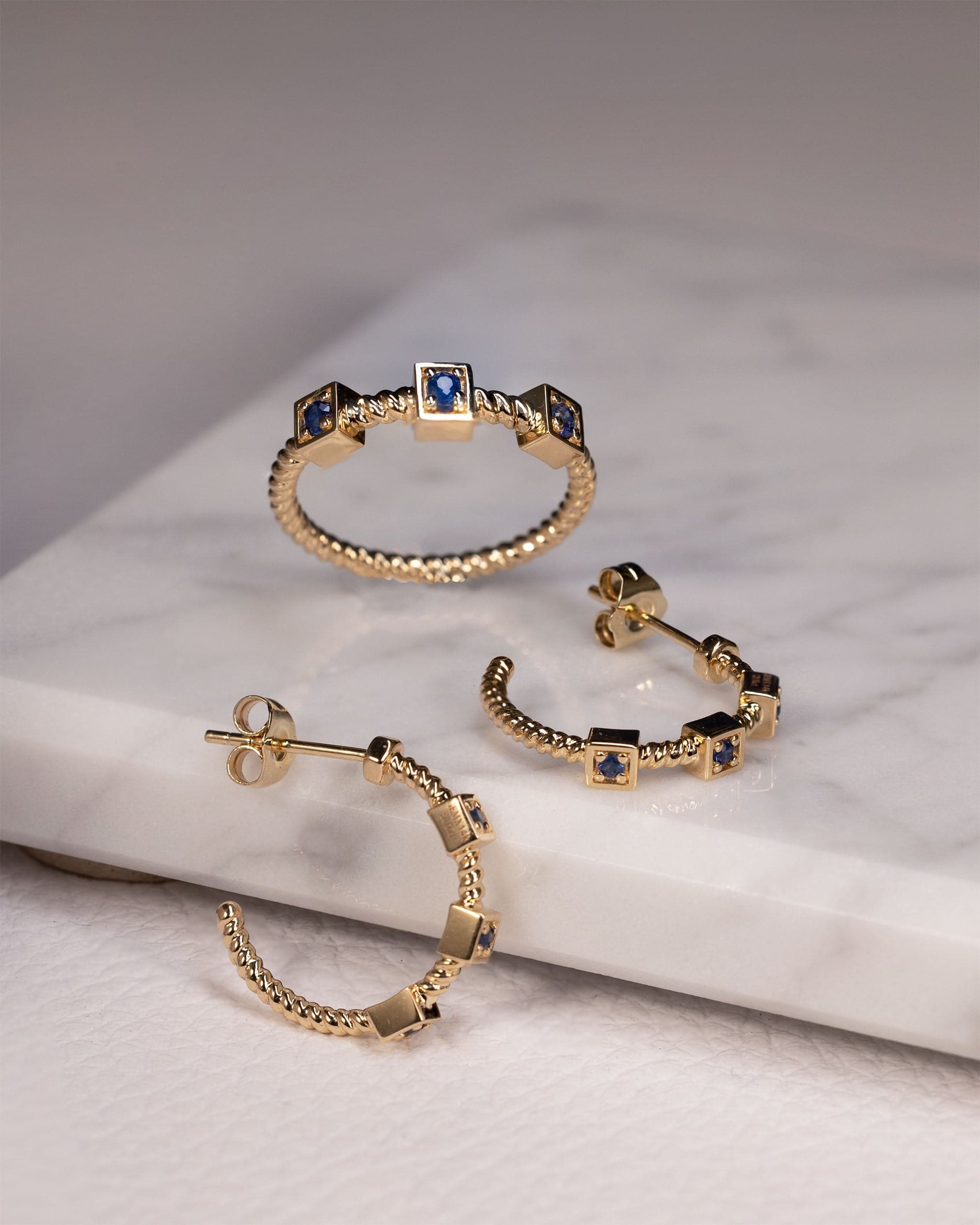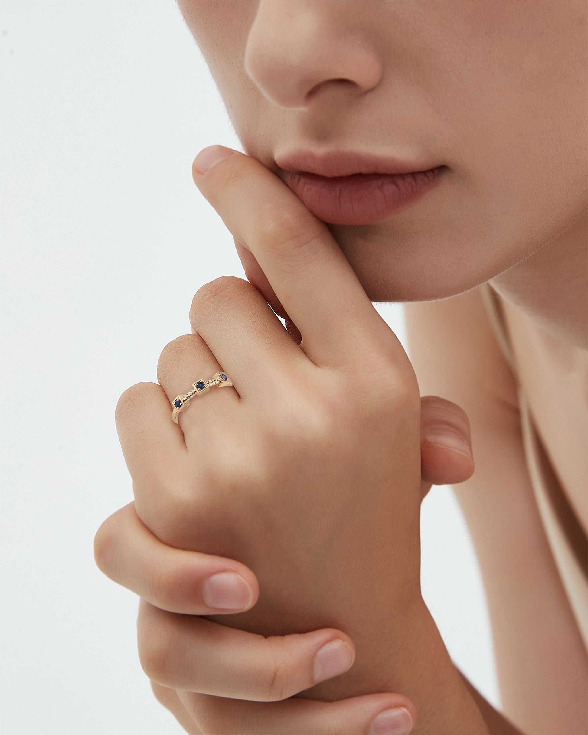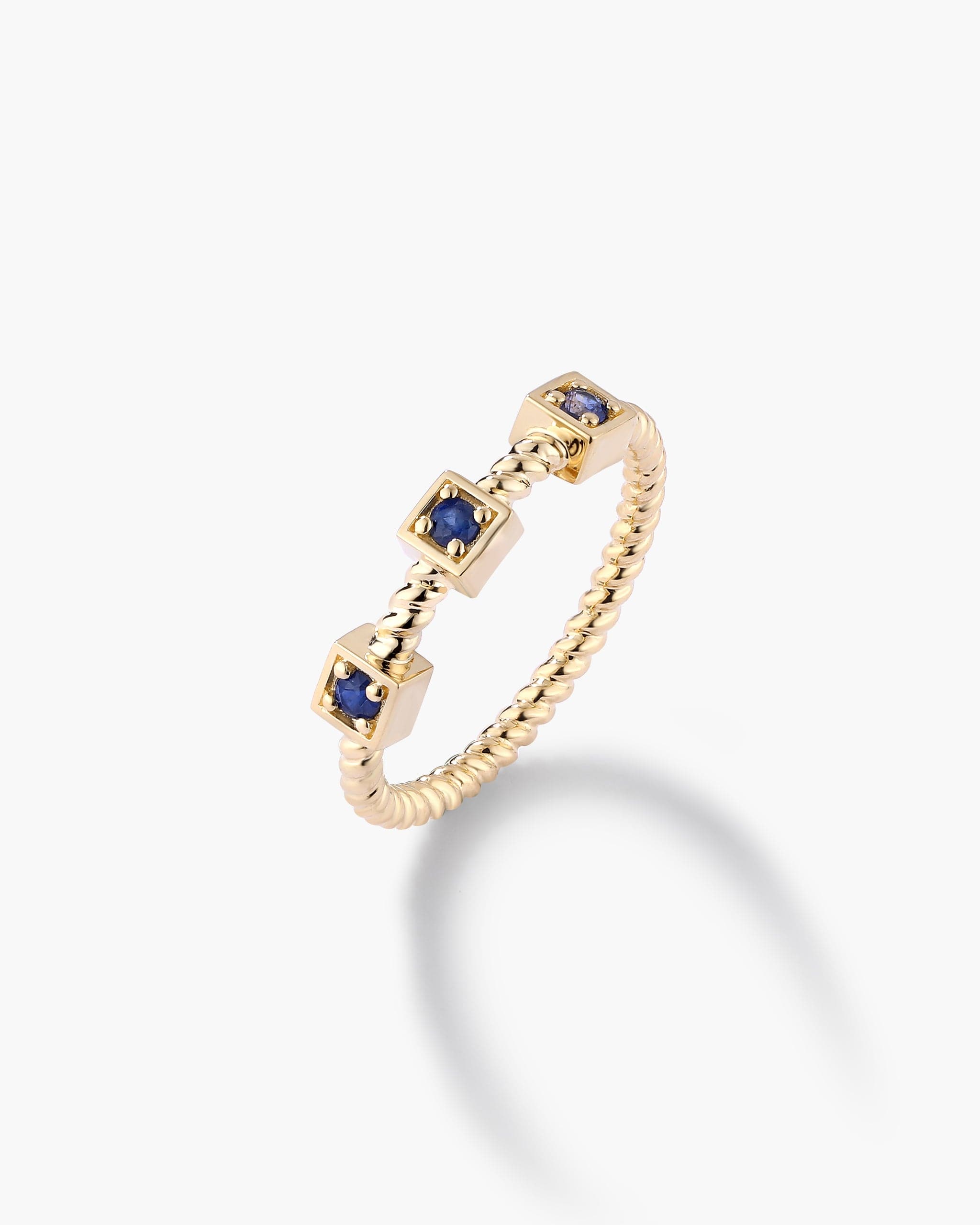 A 10K gold twisted rope band cradles five sapphires arranged into a delicate floral cluster, offering versatile stackable charm.