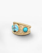 This bold sterling silver ring features a hammered texture, twisted rope borders, a central sugar-loaf cut topaz, and two cabochon turquoise stones. Exudes earthy luxury.