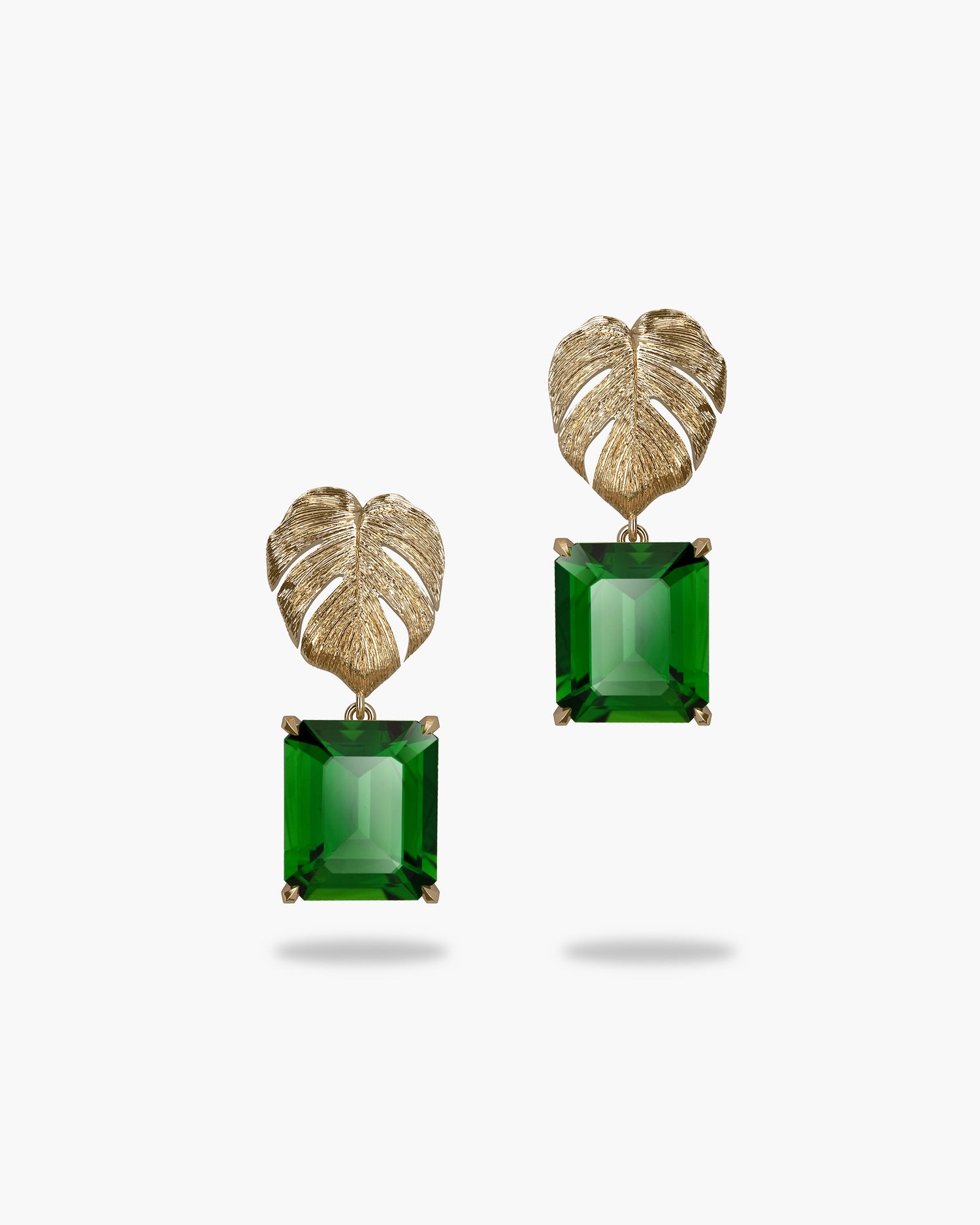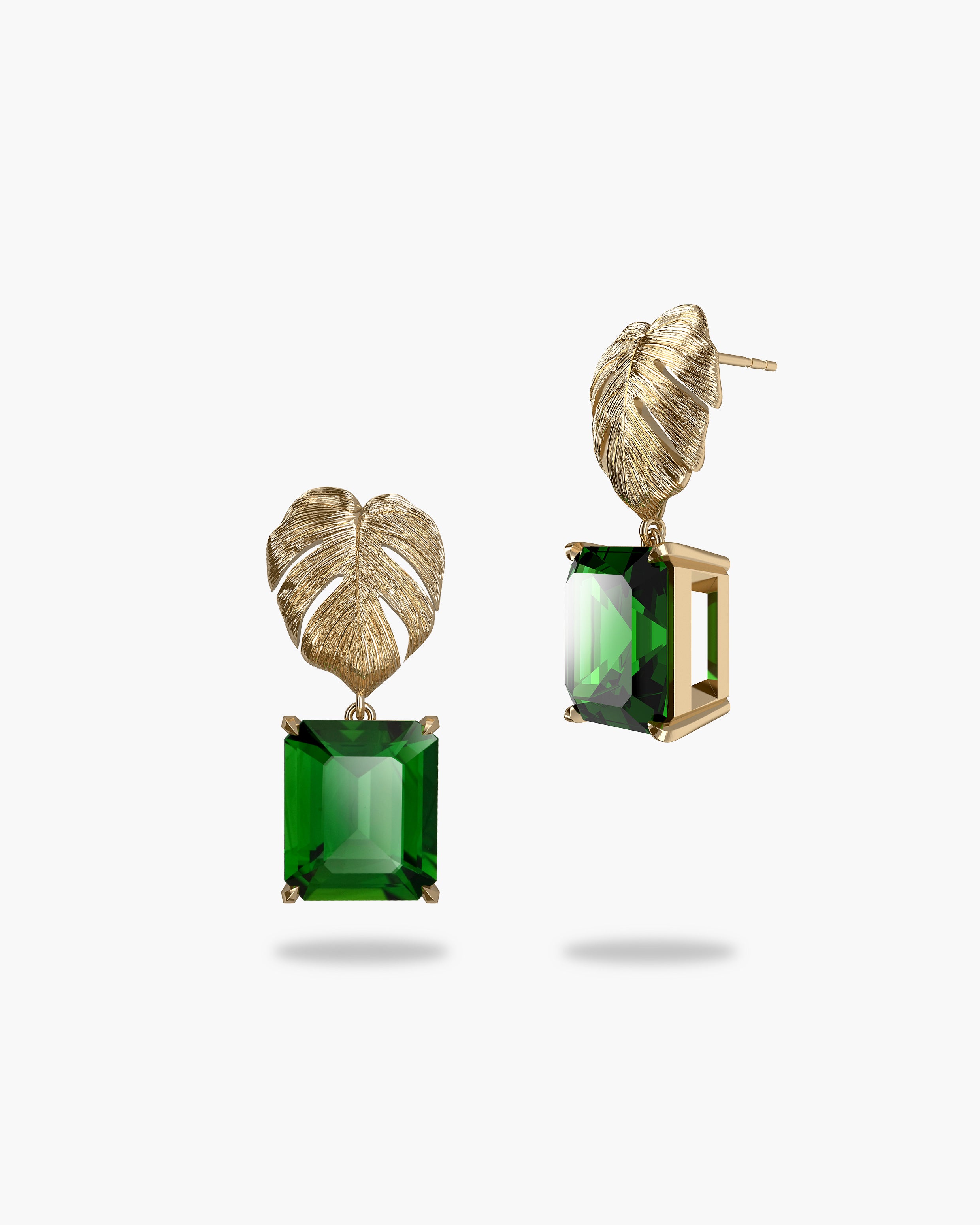 These sculptural earrings pair bold natural obsidian with lush botanical artistry, creating a design that feels both organic and dramatically refined. Each piece features a textured leaf motif—meticulously carved in 925 silver and finished with warm gold plating—its veined surface echoing the tropics’ wild elegance. Suspended below, two large emerald-cut obsidian stones glow with a deep green reminiscent of rainforest shadows, their clean geometric facets contrasting beautifully with the soft, natural flow of the leaf above. The combination of oversized gemstones, precise proportions, and intricate leaf detailing makes this pair a statement of earthy luxury, perfect for collectors drawn to nature-inspired forms with an elevated, artistic finish.