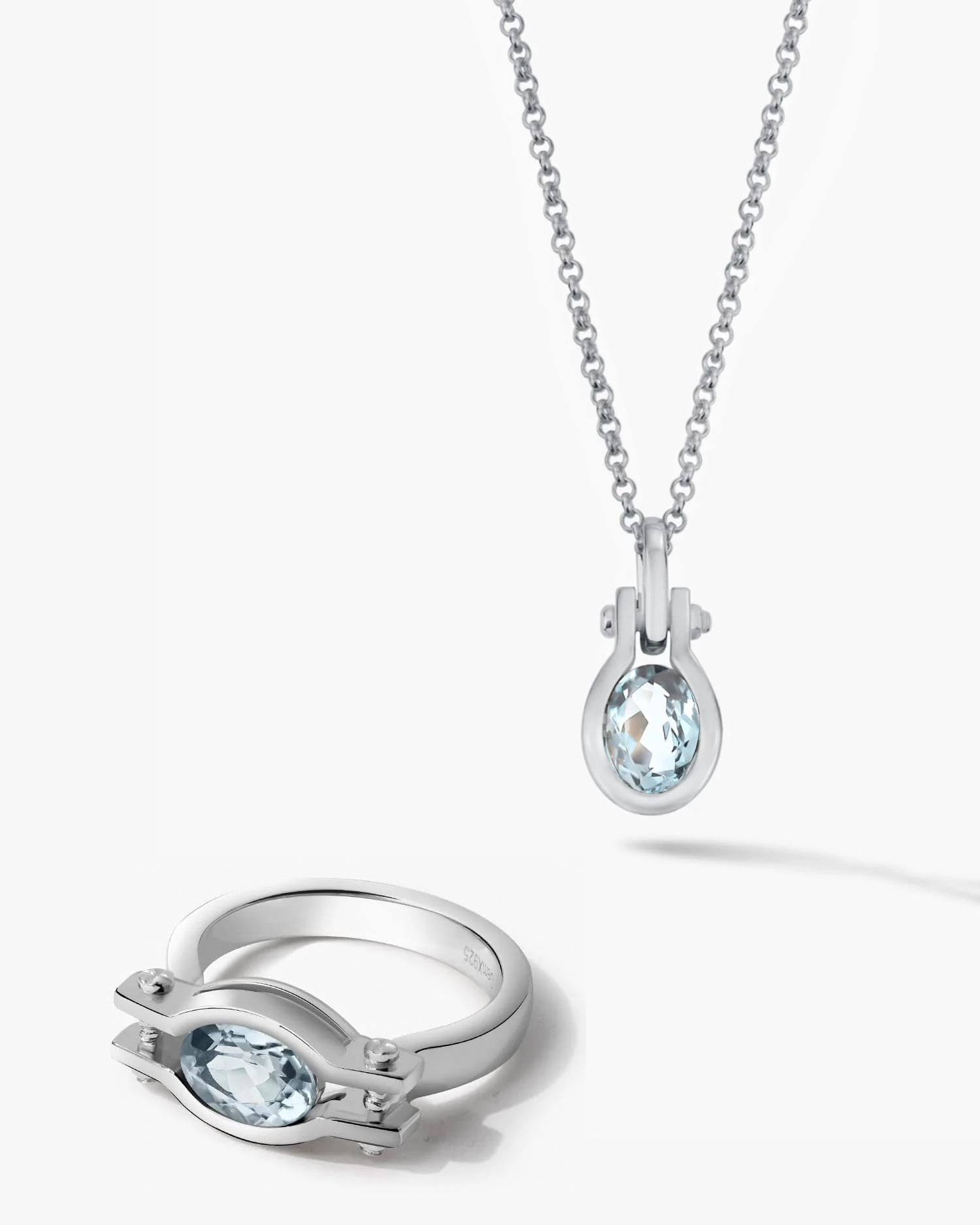A modern blend of industrial style and luxury, featuring a stunning 2-carat aquamarine. This exclusive set includes an elegant ring and necklace, perfect for any occasion.