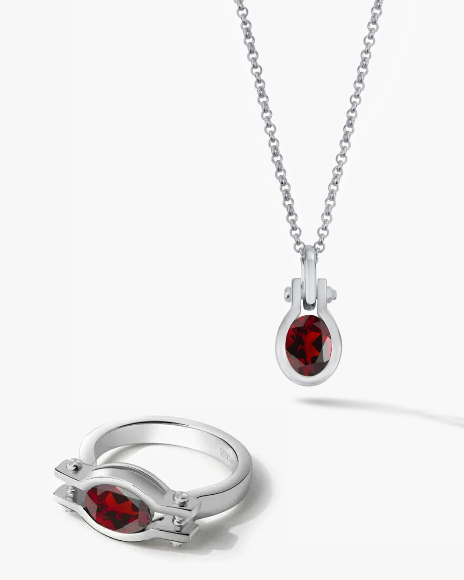 A bold fusion of industrial style and modern luxury, featuring a striking 2-carat garnet. This exclusive set includes a beautifully crafted ring and necklace, perfect for making a statement.
