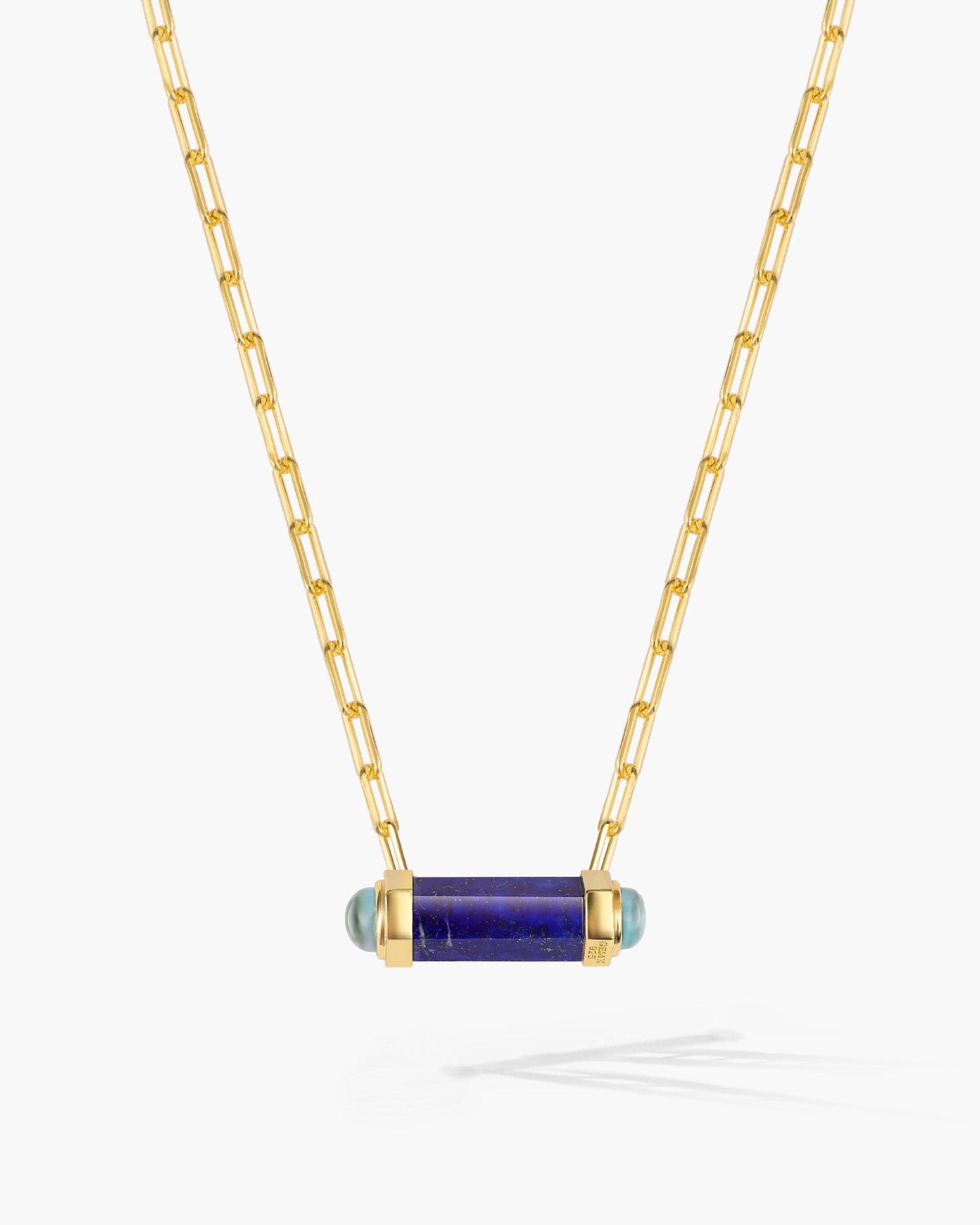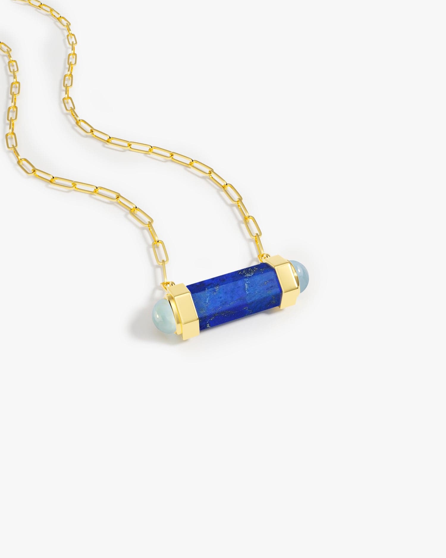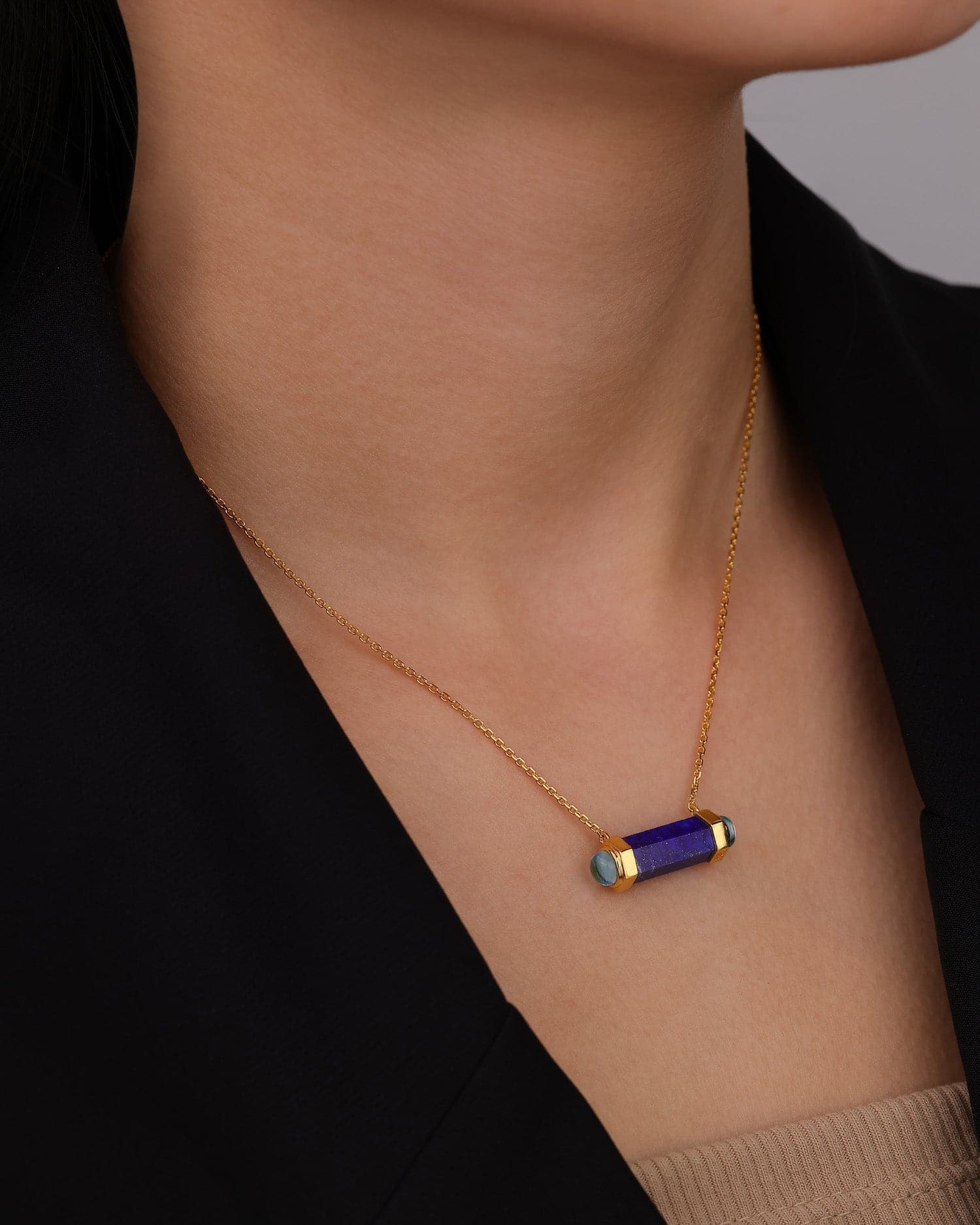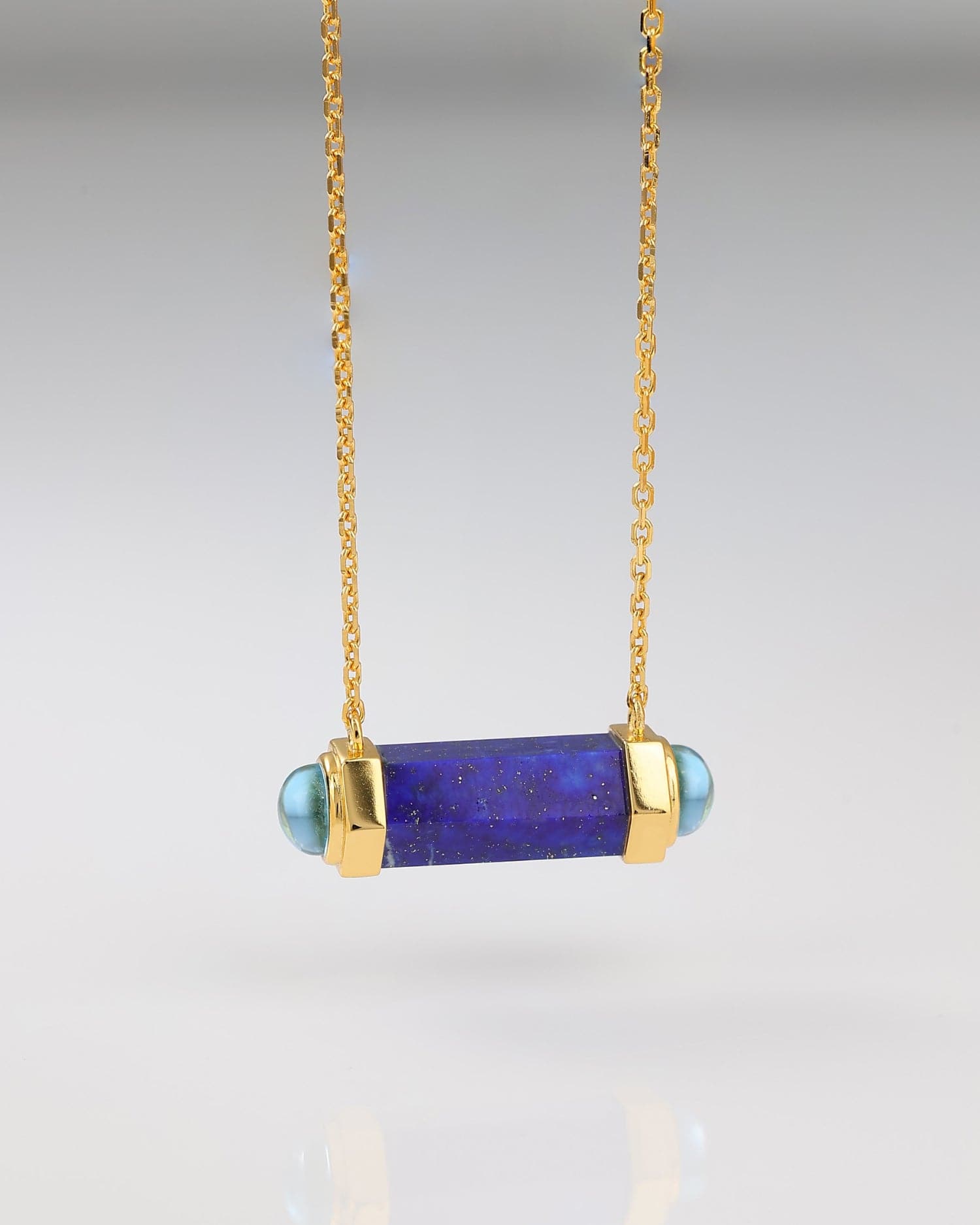 This contemporary necklace is the perfect combination of modern and classic. Crafted with a unique hexagonal column of lapis and toapz, this necklace is sure to stand out in any wardrobe. An undeniably eye-catching piece, it is sure to become an instant favorite.